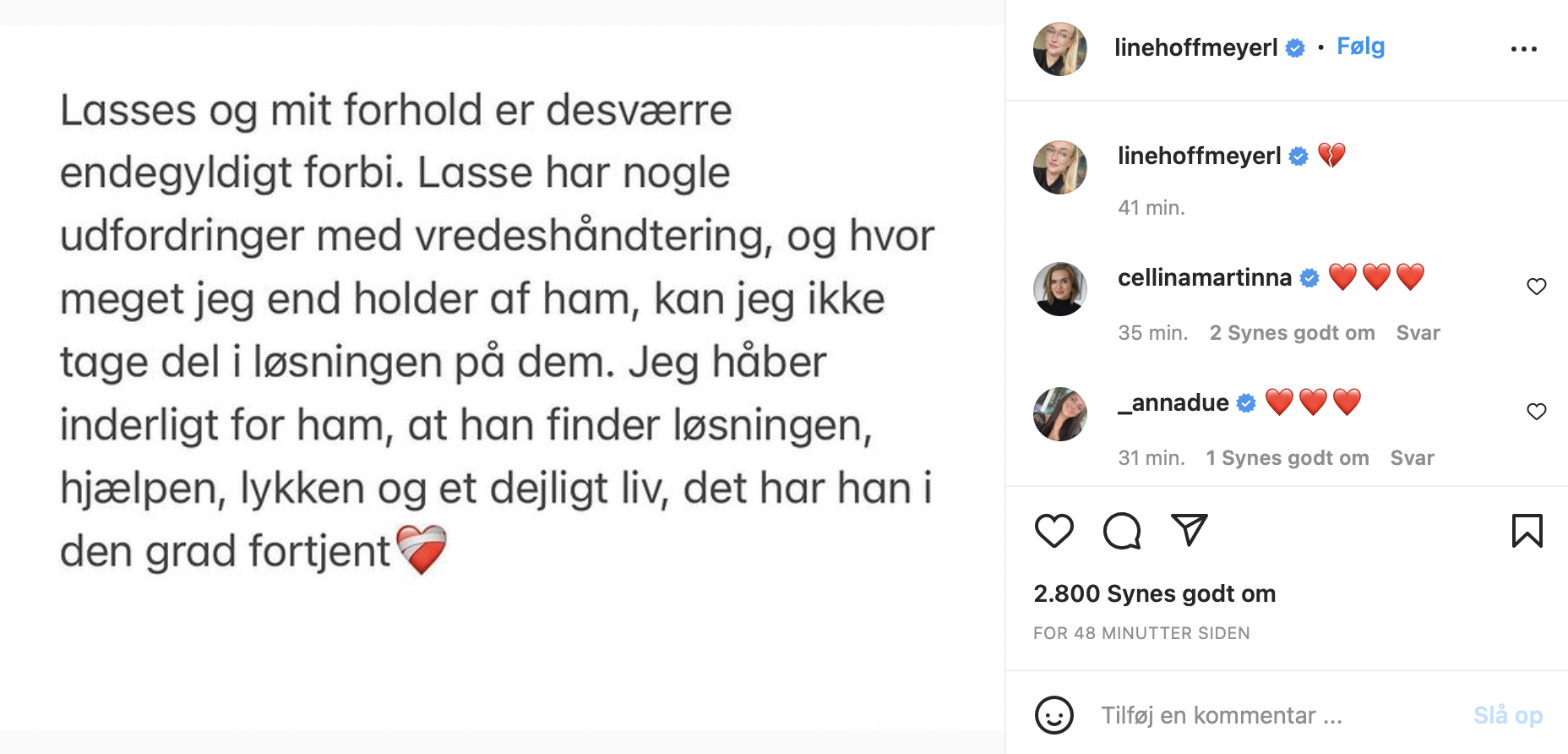 “Lasses og mit forhold er desværre endegyldigt forbi. Lasse har nogle udfordringer med vredeshåndtering, og hvor meget jeg end holder af ham, kan jeg ikke tage del i løsningen på dem,” skriver hun på Instagram, hvor hun fortsætter: