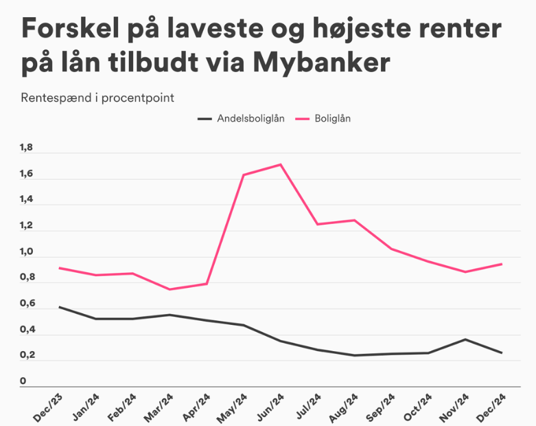 I december lød den gennemsnitlige forskel på 0,9 procentpoint for boliglån og 0,3 procentpoint for andelsboliglån.