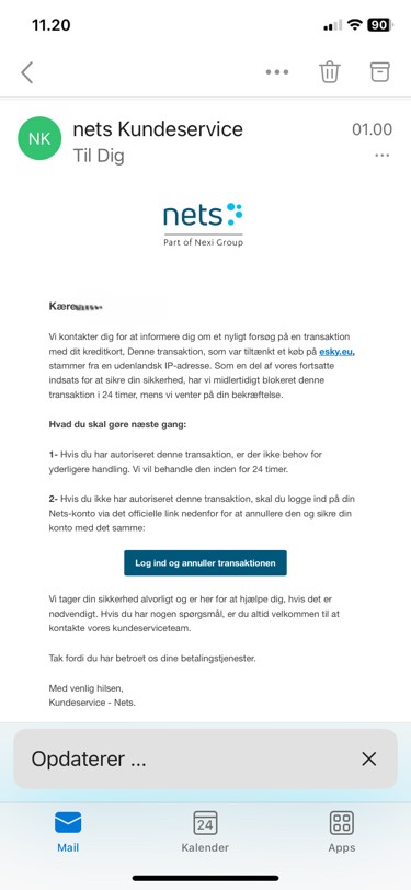 “En svindel-mail er i omløb, hvor modtageren opfordres til at afvise en onlinebetaling angiveligt foretaget på ens kreditkort på esky.eu.,” skriver Nets og fortsætter: