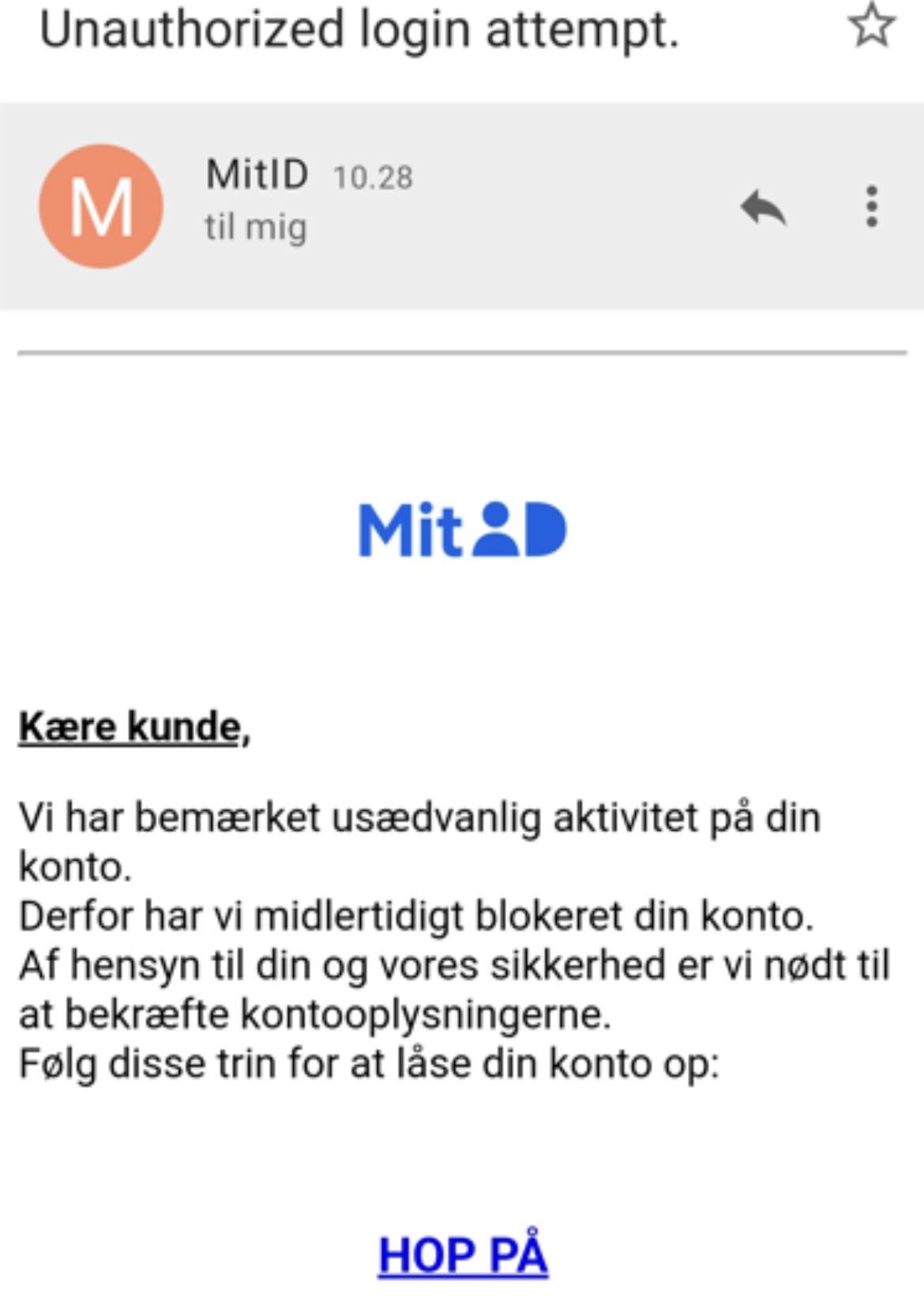 Følg disse trin for at låse din konto:’ Herefter følger linket med teksten ‘Hop på’. Undlad at klikke på linket eller besvare mailen, den kan blot slettes.