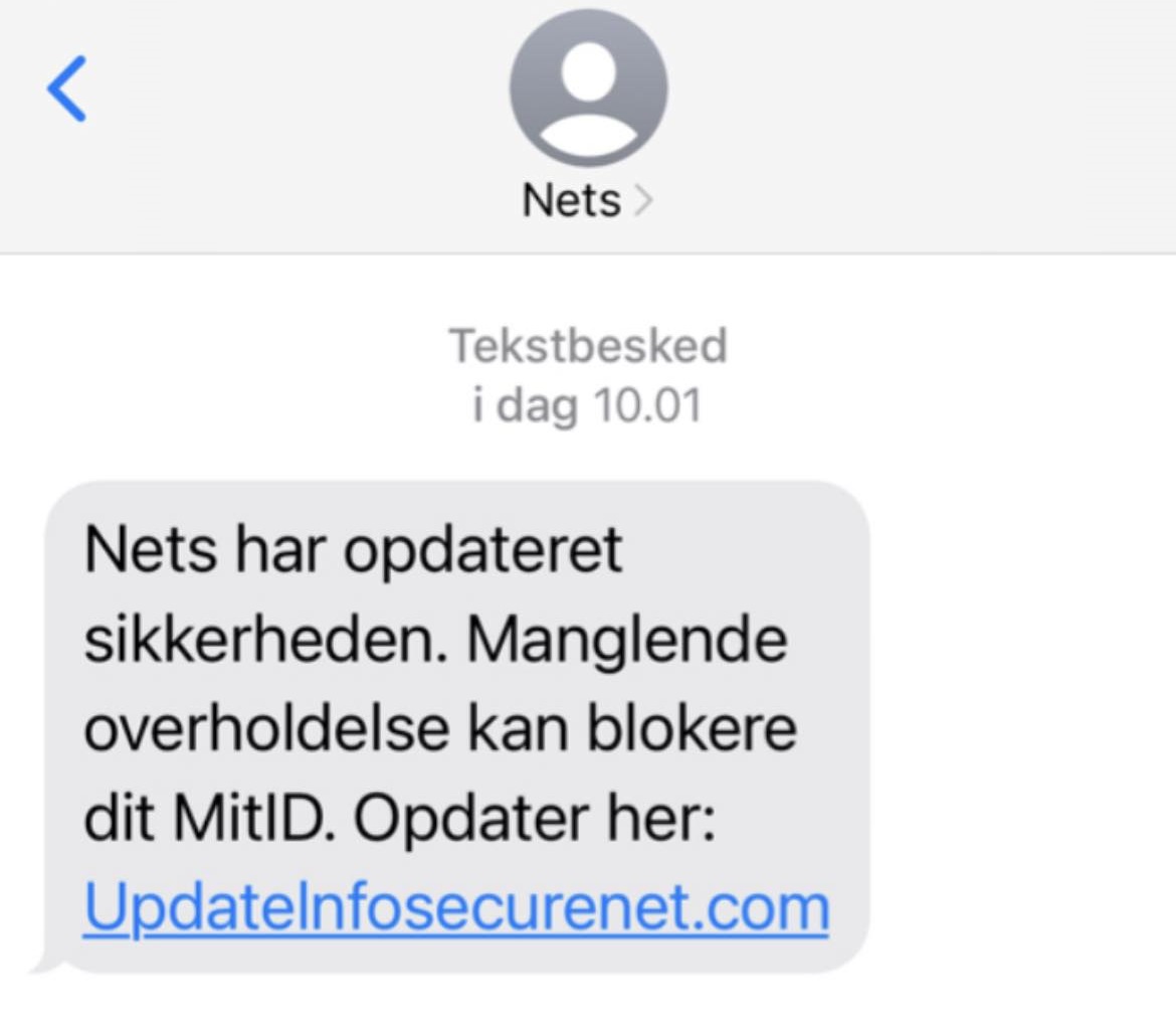 “En sms forsøger at lokke ofre til en forfalsket webside. Beskeden ser ud til at komme fra Nets og lyder: ”Nets har opdateret sikkerheden. Manglende overholdelse kan blokere dit MitID. Opdater her: <link>”