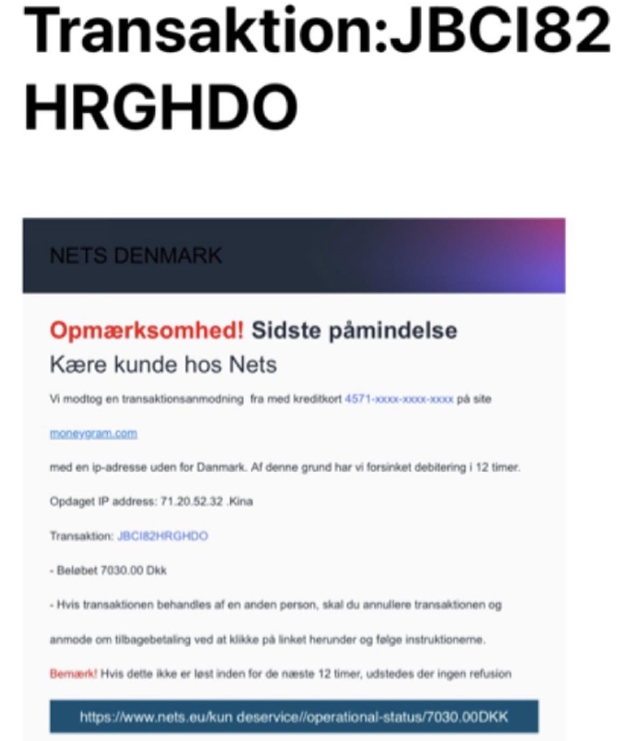 Mailen kan for eksempel begynde: ‘Opmærksomhed! Sidste påmindelse Kære kunde hos Nets Vi har modtaget en transaktionsanmodning fra med kreditkort 4571-xxxx-xxxx-xxxx på site moneygram.com med en ip-adresse uden for Danmark. Af denne grund har vi forsinket debitering i 12 timer. Transaktion: JBCI82HRGHDO – Beløbet 7030.00 Dkk’.