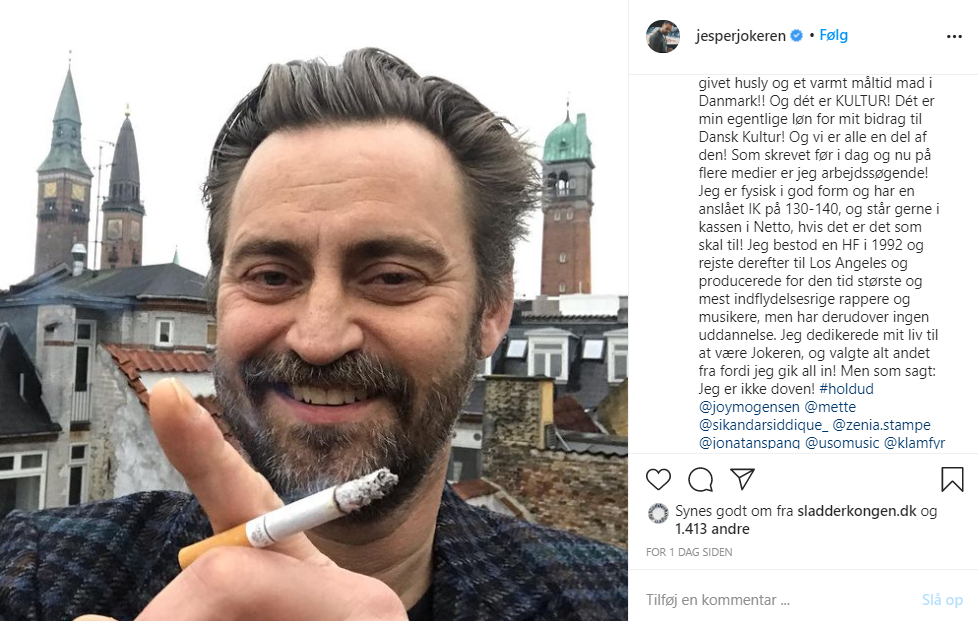 “Som skrevet før i dag og nu på flere medier er jeg arbejdssøgende! Jeg er fysisk i god form og har en anslået IK på 130-140, og står gerne i kassen i Netto, hvis det er det som skal til! Jeg bestod en HF i 1992 og rejste derefter til Los Angeles og producerede for den tid største og mest indflydelsesrige rappere og musikere, men har derudover ingen uddannelse. Jeg dedikerede mit liv til at være Jokeren, og valgte alt andet fra fordi jeg gik all in! Men som sagt: Jeg er ikke doven!” Sådan skriver Jokeren i sit opslag på det sociale medie, og det har fået Nettos HR-direktør, Christian Dahl til at kommentere på Jokerens opslag.