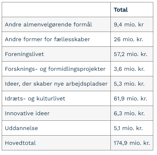 Kigger man ned over de mere end 2.000 projekter, som har fået tildelt støtte, så har langt de fleste kredset om forenings-, idræts- og kulturlivet. Her er der i alt uddelt knap 120 millioner kroner, hvilket svarer til 68 procent af de penge, som er blevet fordelt.