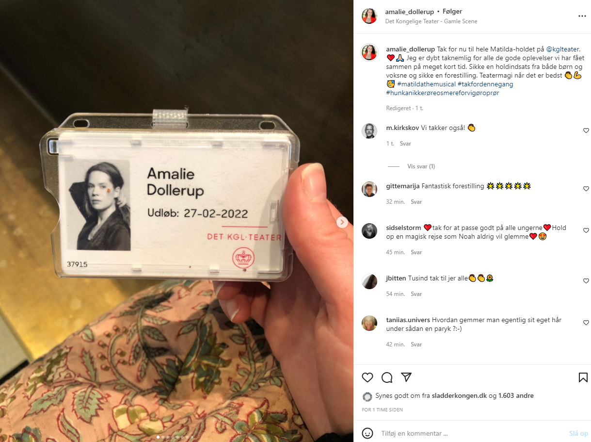 “Tak for nu til hele Matilda-holdet på @kglteater. Jeg er dybt taknemlig for alle de gode oplevelser vi har fået sammen på meget kort tid. Sikke en holdindsats fra både børn og voksne og sikke en forestilling. Teatermagi når det er bedst,” lyder det fra den populære skuespiller.