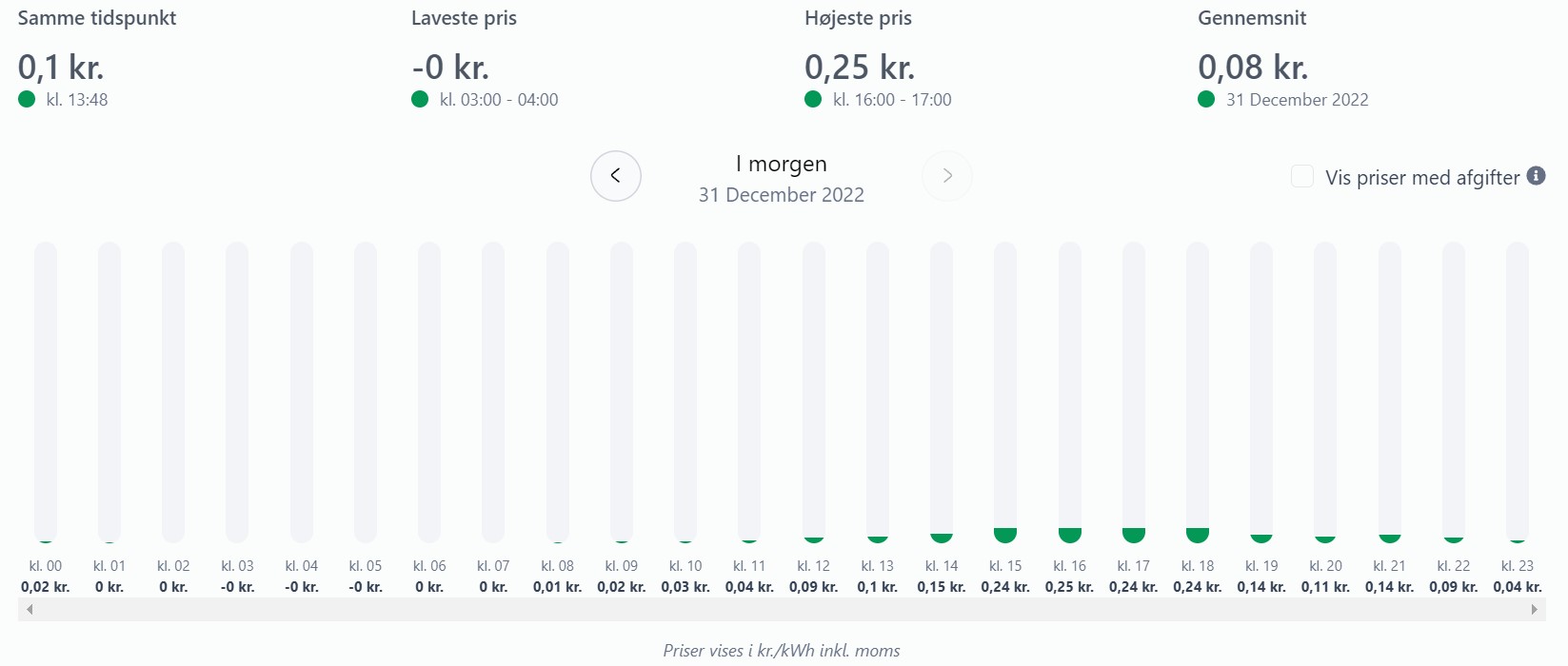 Men hvis du påtænker at udføre nogle strømkrævende aktiviteter, kan du med fordel udføre disse i nat eller i morgen tidlig, da prisen altså er usædvanlig billig.