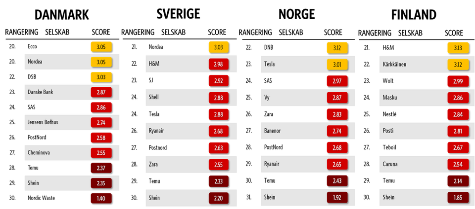 E-handelsplatformene Shein og Temu ligger i bunden af listen over virksomheder, der opererer i de nordiske lande.