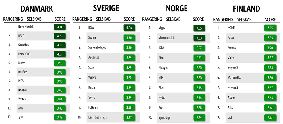 “I toppen af omdømmerangeringen finder vi traditionelle virksomheder, en form for nationalskatte, som LEGO i Danmark, IKEA i Sverige og KONE i Finland. Nordiske alkoholmonopoler som Systembolaget, Vinmonopolet og Alko nyder også borgernes tillid ifølge vores undersøgelse,” udtaler Riku Ruokolahti, der er udviklingsdirektør hos Reputation and Trust Analytics.