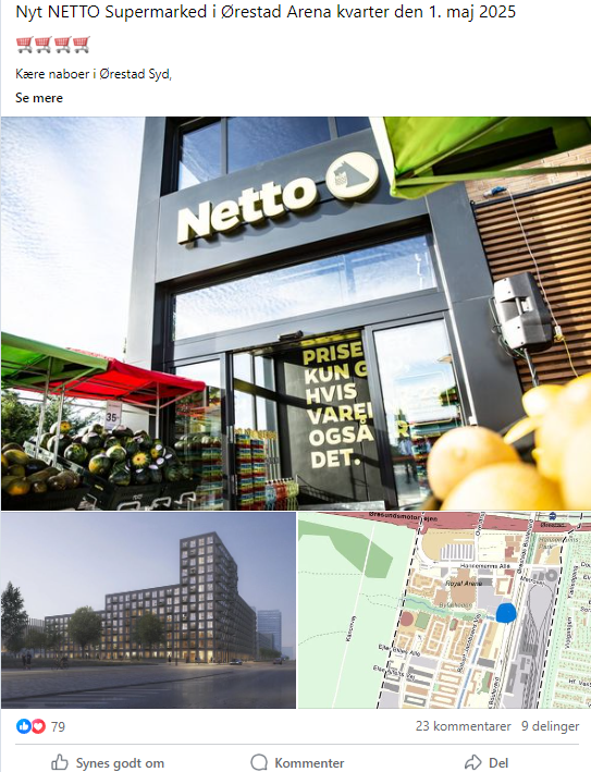“Vi vil gerne informere jer om, at borgernes ønske om flere dagligvarebutikker i vores område er blevet hørt, og der kommer flere til,” skriver Peter Hjorth, der er administrator af ‘ØRESTAD SYD BORGERFORENING‘, i et Facebook-opslag og fortsætter: