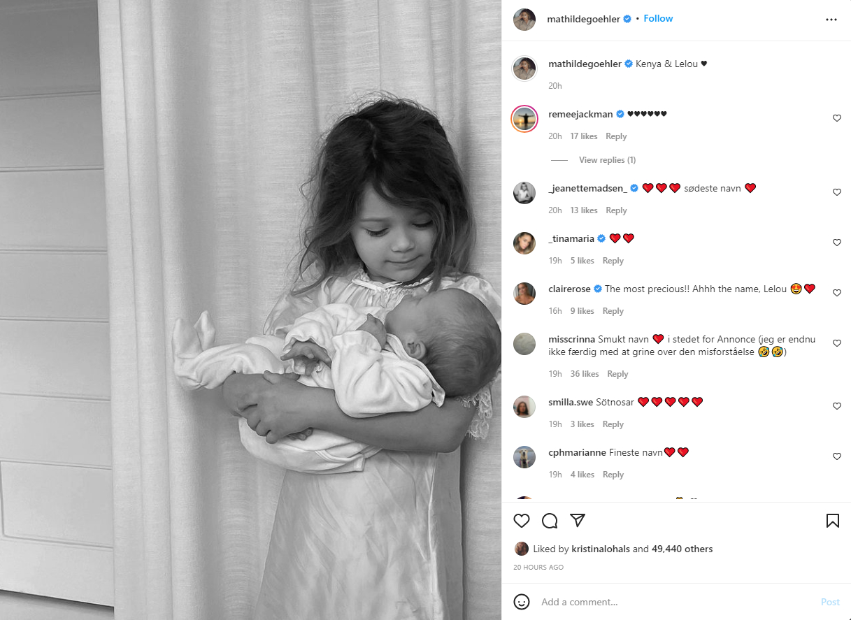 Indtil nu har parret holdt lillesøsters navn hemmeligt, men nu deler de det. Til et billede af storesøster Kenya og lillesøster skriver Mathilde Gøhler “Kenya og Lelou”.