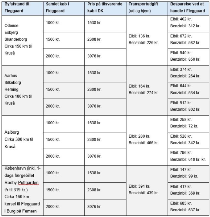 Nyere prisundersøgelser viser, at Fleggaards priser i gennemsnit er 30-35 procent lavere end i danske dagligvarebutikker. Prisen for turen skal derfor lægges til grænsebesparelsen i forhold til danske supermarkeder.
