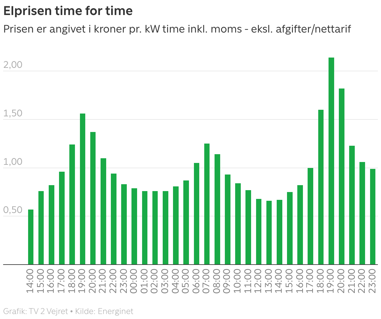 TV 2 kan nemlig fortælle at dagens vejr efterlader et stort hul i dagtimerne, hvor en kilowatttime kun vil koste 0,59 kroner.