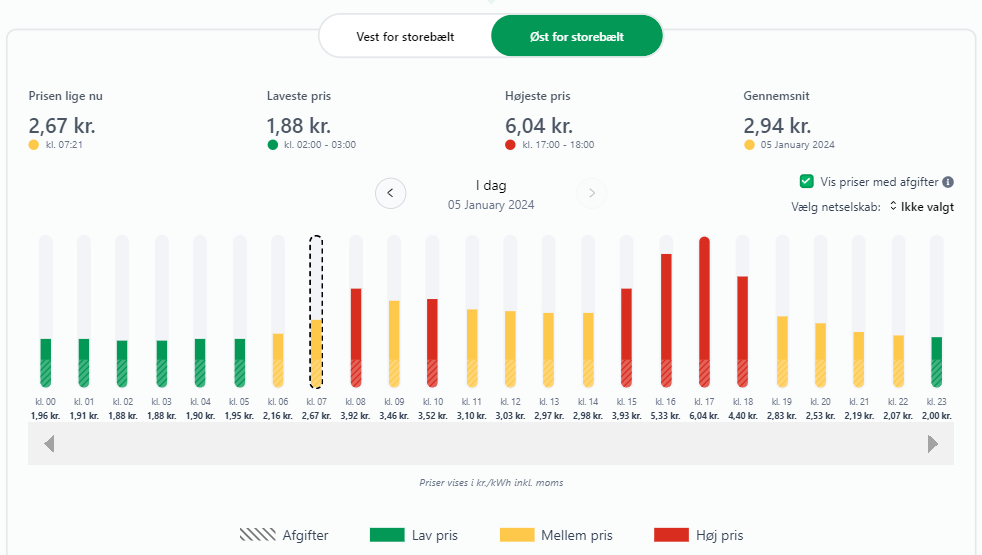 Det billigste tidspunkt resten af fredagen er klokken 23, hvor prisen for en kWh ligger på 2.00 kroner. Begge priser er inklusiv moms og afgifter.
