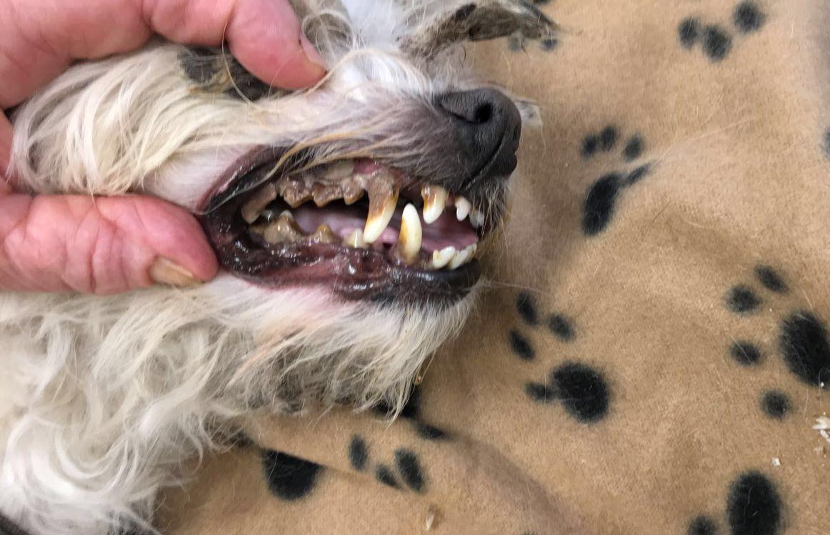 Den lille hund, en malteser, var meget tynd og havde tydelige smerter. Den blev derfor hentet af kredsformand Marianne Larsen og kørt til en dyrlæge på Mors. Her viste det sig, at hundens tænder var så rådne og betændte, at blodet stammede fra hans mund. De rådne tænder gjorde også at han ikke havde kunne spise i lang tid.
