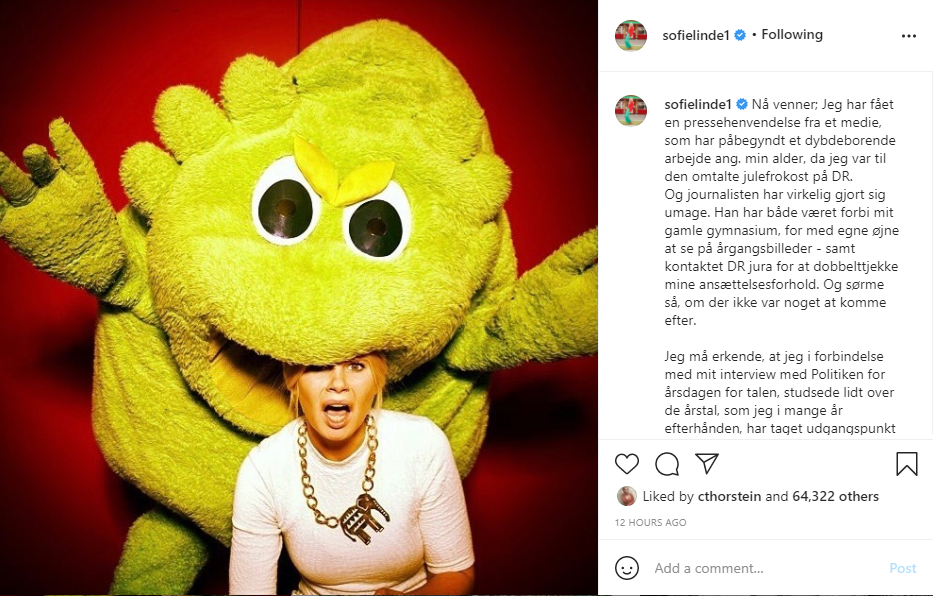 “Nå venner; Jeg har fået en pressehenvendelse fra et medie, som har påbegyndt et dybdeborende arbejde ang. min alder, da jeg var til den omtalte julefrokost på DR. Og journalisten har virkelig gjort sig umage. Han har både været forbi mit gamle gymnasium, for med egne øjne at se på årgangsbilleder – samt kontaktet DR jura for at dobbelttjekke mine ansættelsesforhold. Og sørme så, om der ikke var noget at komme efter,” skriver hun og fortsætter: