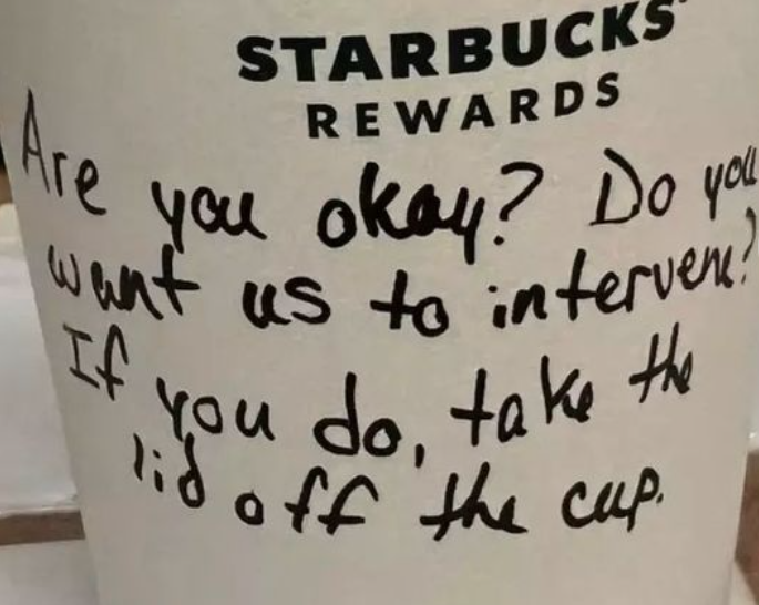 Men baristaen tilbød mere end blot en ekstra kop kakao. Koppen indeholdt nemlig også en tekst, hvor der stod: “Er du okay? Vil du have os til at gribe ind? Hvis du ønsker det, så tag låget af koppen.”