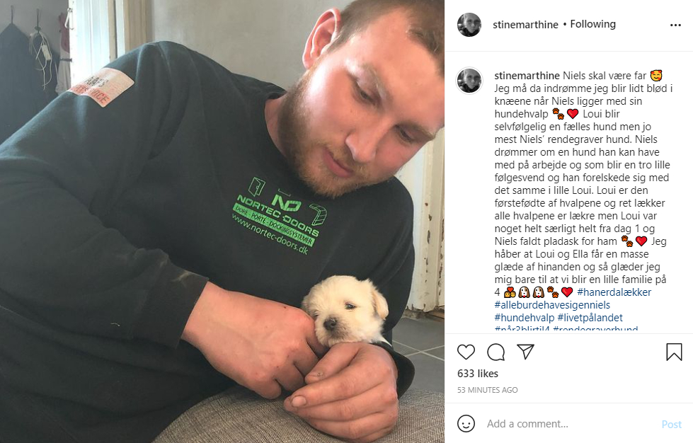 “Loui bliver selvfølgelig en fælles hund men jo mest Niels’ rendegrader hund. Niels drømmer om en hund han kan have med på arbejde og som bliver en tro lille følgesvend og han forelskede sig med det samme i lille Loui,” uddyber hun i opslaget.