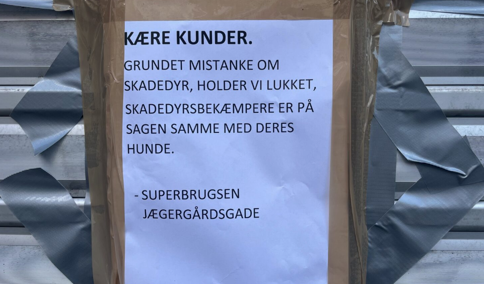 “Grundet mistanke om skadedyr, holder vi lukket, skadedyrsbekæmpere er på sagen med deres hunde”, stod det skrevet på sedlen.