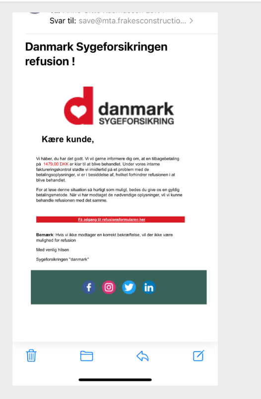 “Nye falske beskeder om refusion fra Sygeforsikringen “danmark” er i omløb. Tryk ikke på links og opgiv aldrig personlige oplysninger over mail.