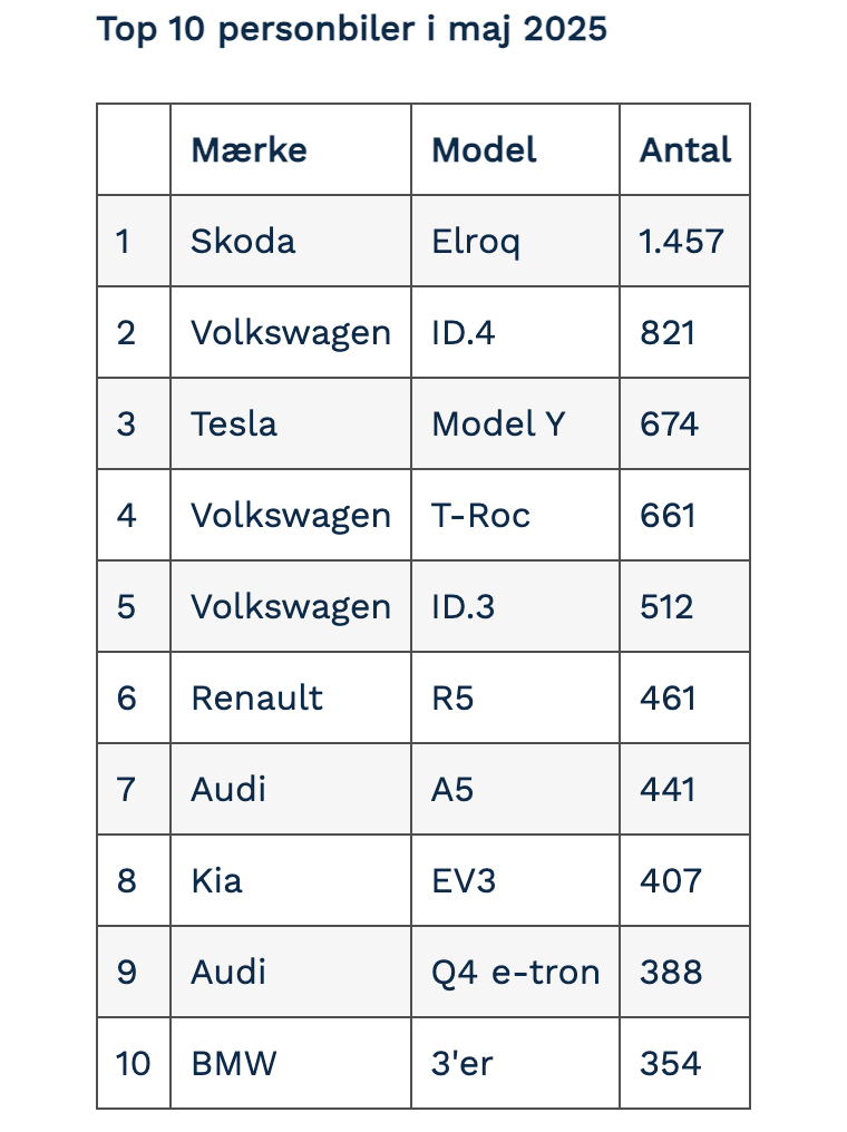 I maj 2025 blev der indregistreret 17.953 nye personbiler i Danmark, en fremgang på 23,3 procent i forhold til maj 2024.