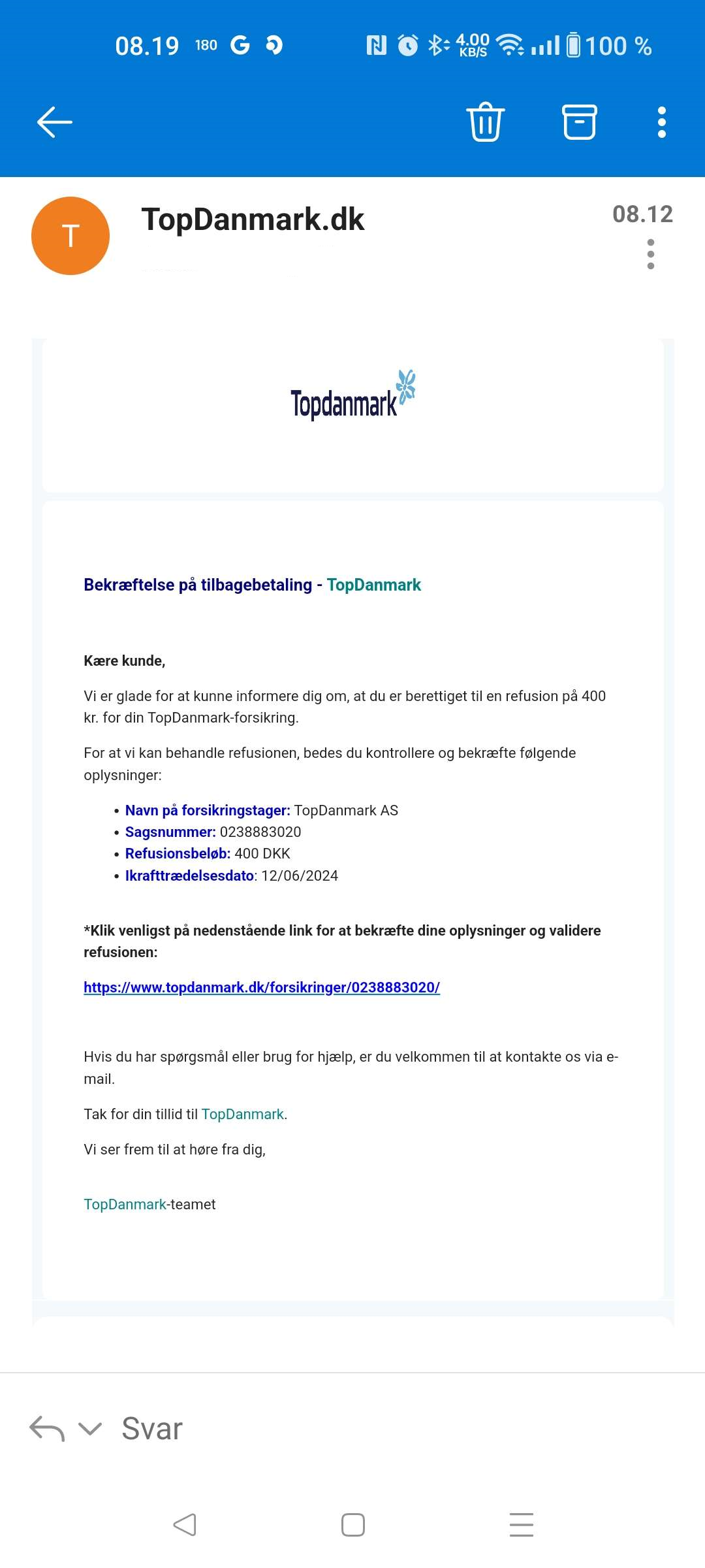 I mailen står der, at modtageren er berettiget til at få 400 kroner tilbage i refusion for en forsikring i Topdanmark. Modtageren opfordres til at klikke på et link.