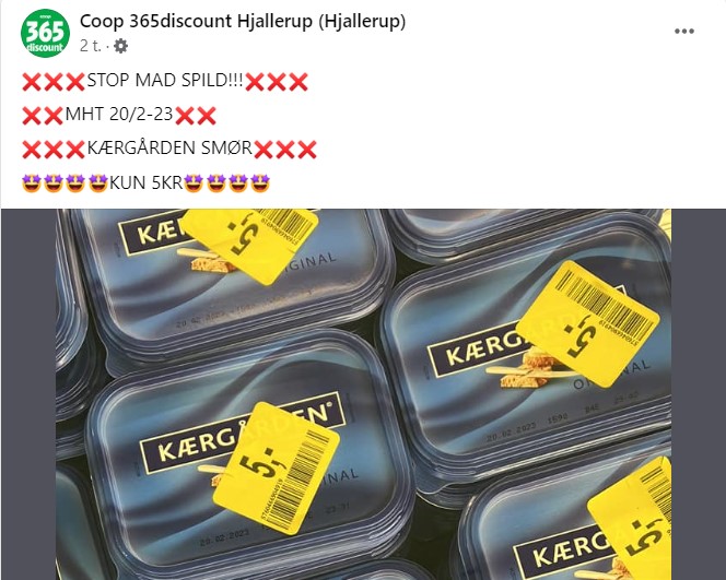 “STOP MAD SPILD!!! MHT 20/2-23. KÆRGÅRDEN SMØR KUN 5KR,” skriver butikken i et opslag på Facebook.