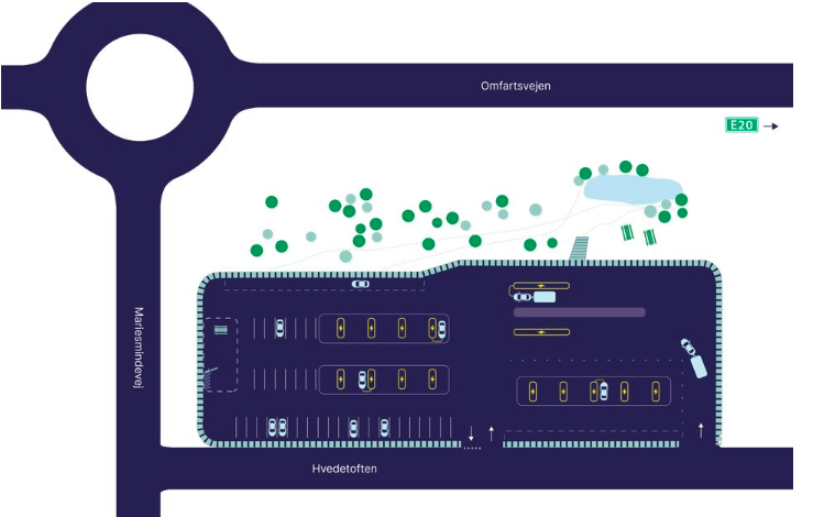 Udover ladeparken byder pladsen på 38 p-pladser for samkørsel, cykelparkering, venteareal og grønne områder. Pladsen er placeret med let adgang til E20 Fynske Motorvej.