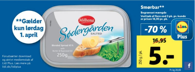 Hvis du ikke har en Lidl i nærheden eller gerne vil have noget andet smør, så kører Rema 1000 i øjeblikket med tilbud på Lurpak. Du kan få Lurpak Smør, Lurpak Smørbar og Lurpark Smør Let til 10 kroner pakken.