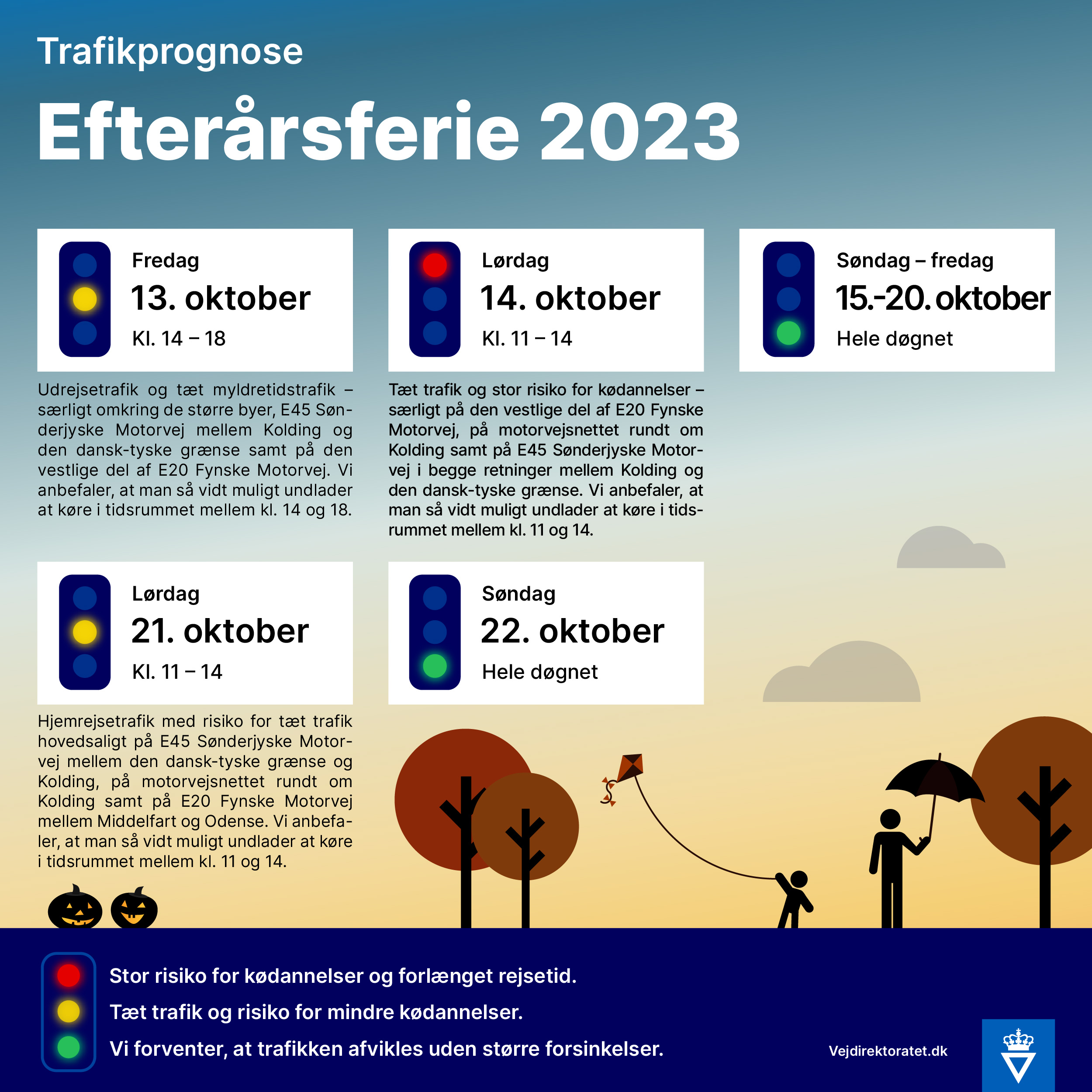 Den første udrejsetrafik vil man allerede se fredag 13. oktober, hvor der vil være et øget tryk på vejene i og omkring de store byer i eftermiddagstimerne mellem kl. 14.00 og 18.00. Den største rejsedag bliver dog lørdag 14. oktober, hvor der er stor risiko for tæt trafik og kødannelse i tidsrummet mellem kl. 11.00 og 14.00.