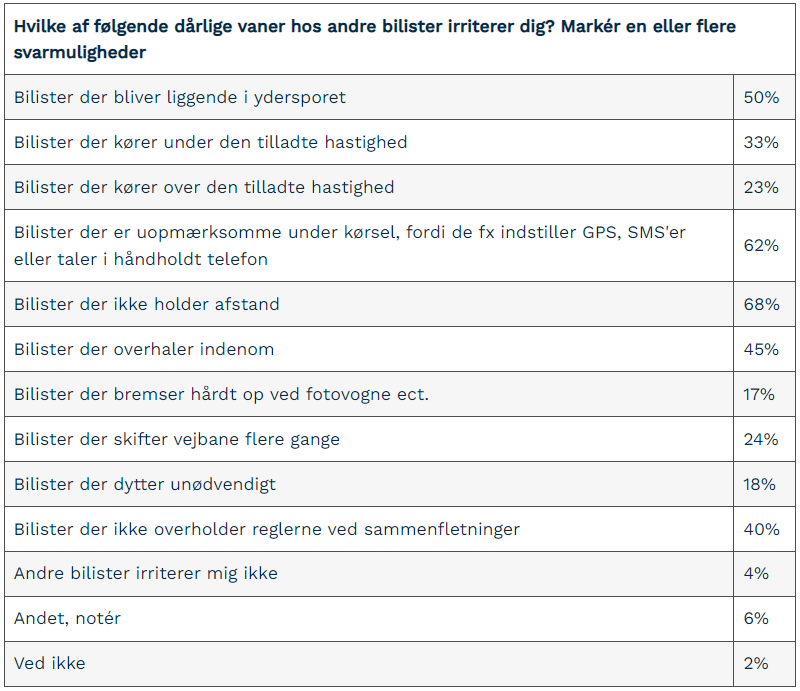 Klart flest bilister, hele 7 ud af 10, peger på manglende afstand, som den mest irriterende vane i trafikken, hvorfor den skiller sig ud, mens 6 ud af 10 finder uopmærksom kørsel grundet eksempelvis GPS-indstilling eller telefonsamtaler som den mest irriterende vane. Derudover peger hver anden på, at biler der bliver liggende i ydersporet er særligt frustrerende.