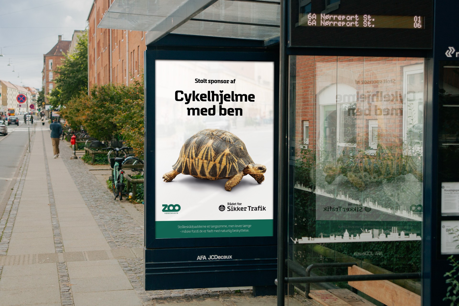 Fra mandag den 7. april og i de kommende uger vil tusindvis af cyklister på de trafikerede veje omkring ZOO København og på Rådet for Sikker Trafiks sociale medier derfor blive mødt af plakater med en stor, ægte stråleskildpadde og med overskriften ”Cykelhjelme med ben”.
