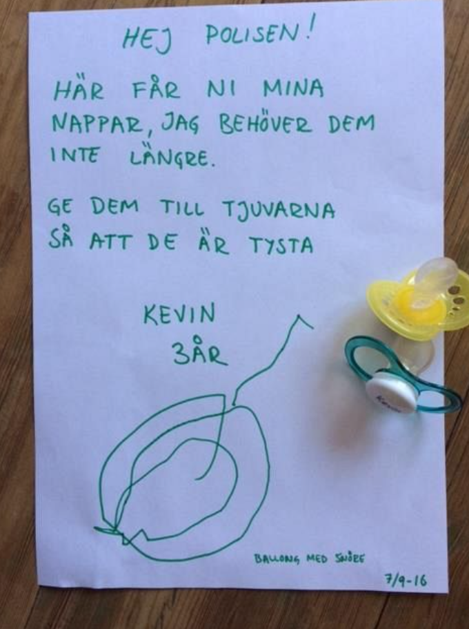 “Hej politiet! Her har I mine sutter. Jeg har ikke brug for dem længere. Giv dem til tyvene, så de kan være stille. Kevin, 3 år”.