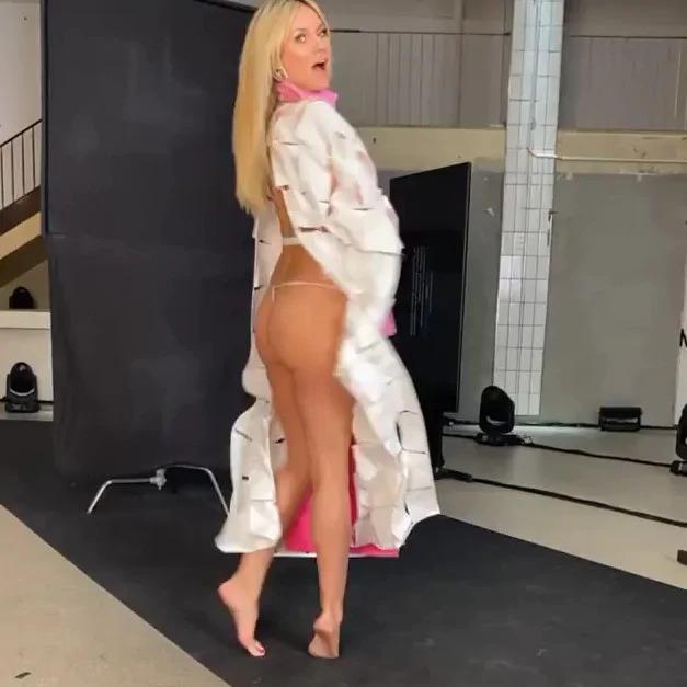 Det sjove klip viser den tidligere Project Runway-vært iført en meget lille lyserød g-streng samt en anderledes toiletpapirkjole. Man ser hende desuden lave en fræk, skulderlig posering.