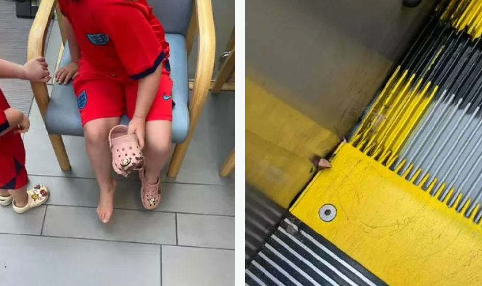 En rystet mor advarer nu andre forældre om potentiel fare ved at have Crocs på på rulletrapper.