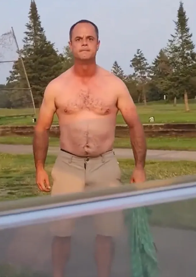 Overraskende nok river han sin t-shirt af, før han viser sine muskler og råber flere bandeord mod gruppen. Han kan også høres råbe: “Kan du se det? Det er en fyr, der har været i himlen, b****. Og vil du teste Gud? Så kom og få tæsk.”