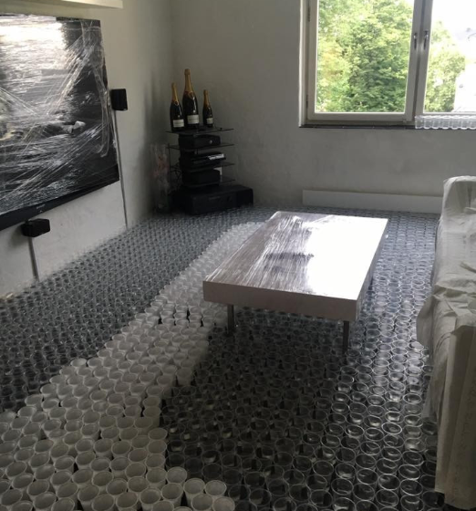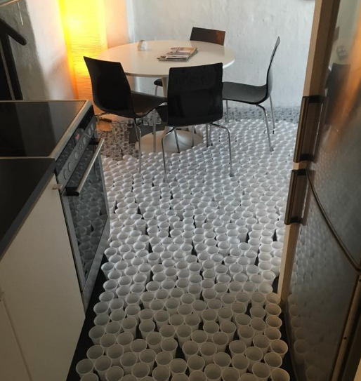 Vennerne havde nemlig besluttet sig for at købe 3.200 plastikkopper, som de havde fyldt med vand og stillet op og ned af hinanden over hele Eriks gulv.