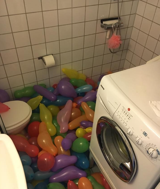 Derudover havde de blæst et par hundrede balloner op, som de havde efterladt på badeværelset. Sofaen var tilmed pakket ind i toiletpapir, mens sofabordet og fjernsynet havde fået hele turen med plastfolie.