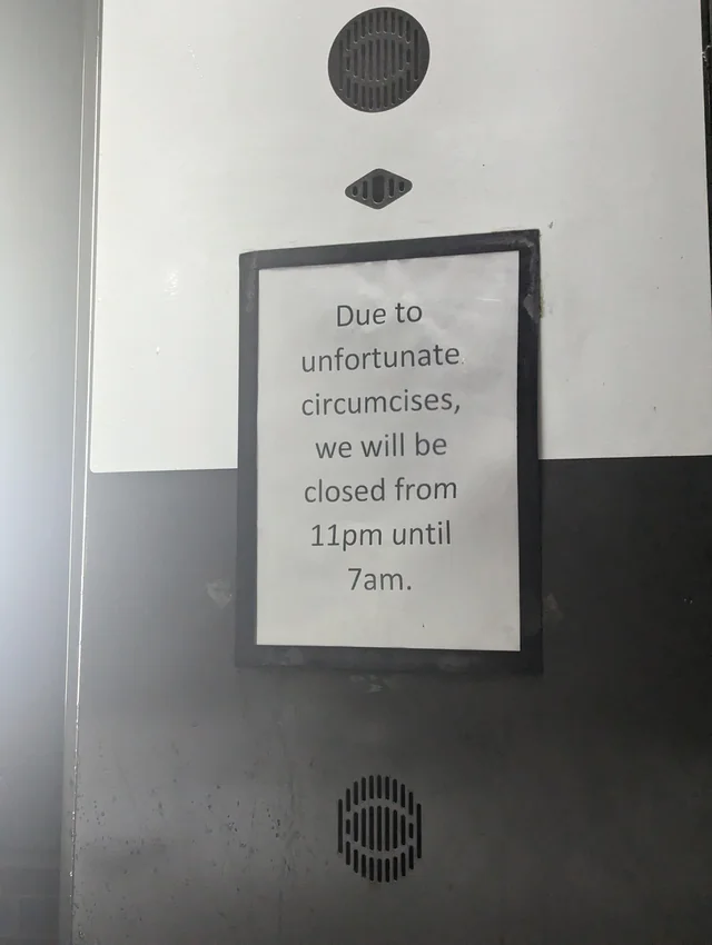 Der var nemlig blevet lavet en stavefejl, der formåede at ændre hele betydningen af skiltet og ‘omstændighederne’ for deres lukning. På skiltet stod der følgende: ‘Due to unfortunate circumcises, we will be closed from 11pm until 7am’.