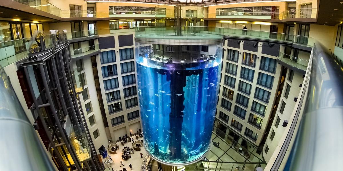 Akvariet var at finde inde i luksushotellet Raddison Blu’s hotellobby i det centrale Berlin og er det største fritstående cylinderakvarie i verden.