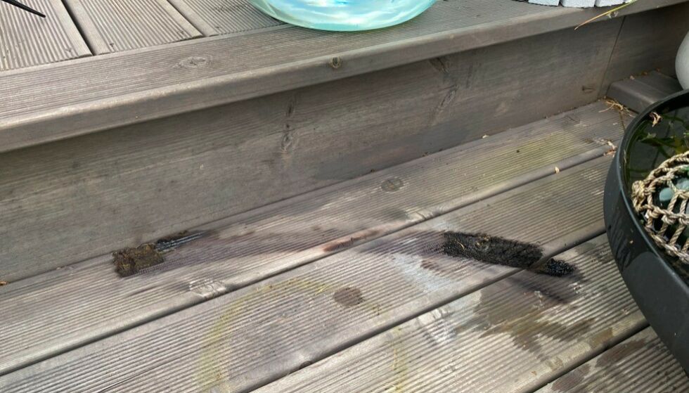 Efter en periode med gråt og vådt vejr slog det pludselig om til varme og solskin. Det var på dette tidspunkt, at Britt fik øje på de store brandmærker på terrassebrædderne.