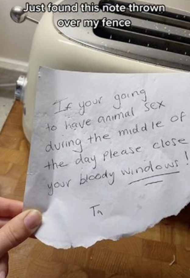 “Hvis du skal have dyresex midt på dagen, så luk venligst dine skide vinduer!,” læser sedlen.