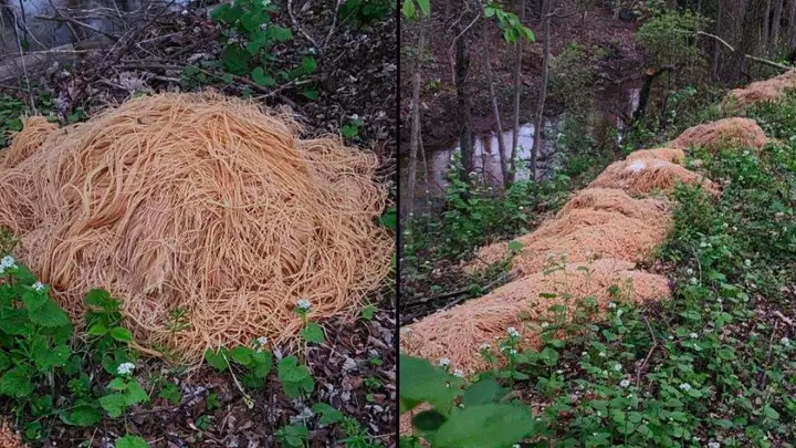 Ved vandkanten lå der 500 pund (ca. 225 kg) kogt spaghetti, ziti og makaroni i skovbunden.