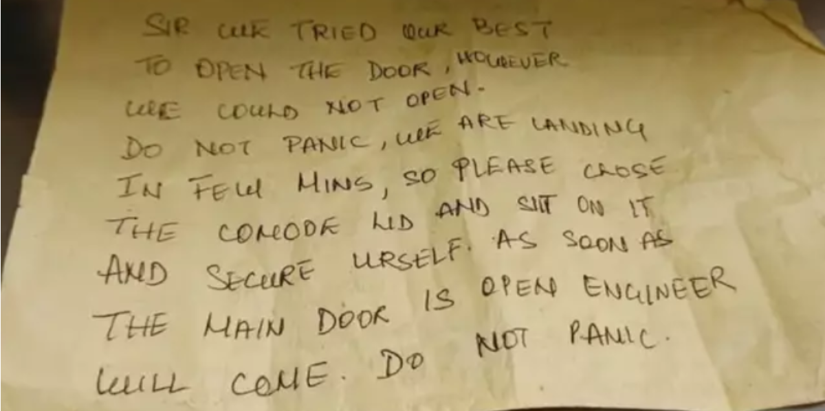 “Herre, vi prøvede vores bedste for at åbne døren, men det kunne vi ikke. Gå ikke i panik. Vi lander om et par minutter, så luk venligst låget og sæt dig på det og sikre dig. Så snart hoveddøren er åben, kommer en ingeniør. Gå ikke i panik,'” stod der sort på hvidt.