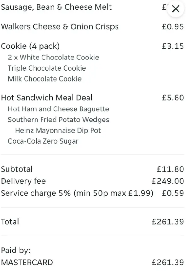 Liam bestilte en Hot Sandwich Meal Deal, fire cookies og Walkers Cheese & Onion-chips, hviket kostede ham cirka 104 kroner.