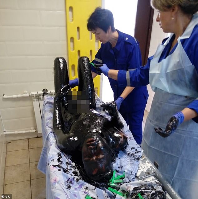 Manden som ikke ønsker at få sit navn frem, overlevede mirakuløst, efter at han faldt i en stor pøl med tjære.