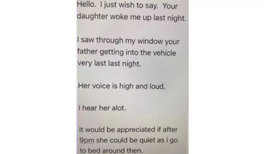 Beskeden fra naboen lyder: “Hej, jeg vil bare sige, at din datter vækkede mig i nat. Jeg så gennem mit vindue – din far kom ind med bilen meget sent i går. Hendes stemme er høj og larmende. Jeg hører hende tit. Jeg ville sætte pris på, hvis hun efter klokken 21 kunne være stille, da jeg går i seng deromkring.”