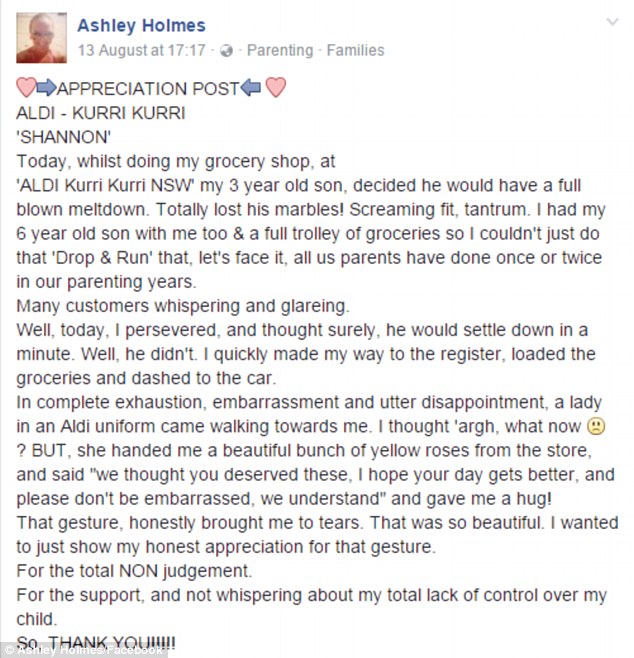 “I min totale udmattelse, skuffelse og skam kom en kvinde, der arbejder hos Aldi, hen til mig. Jeg tænkte “hvad er det nu?”,” forklarer moderen i et opslag på Facebook, som har fået tusindvis af delinger.