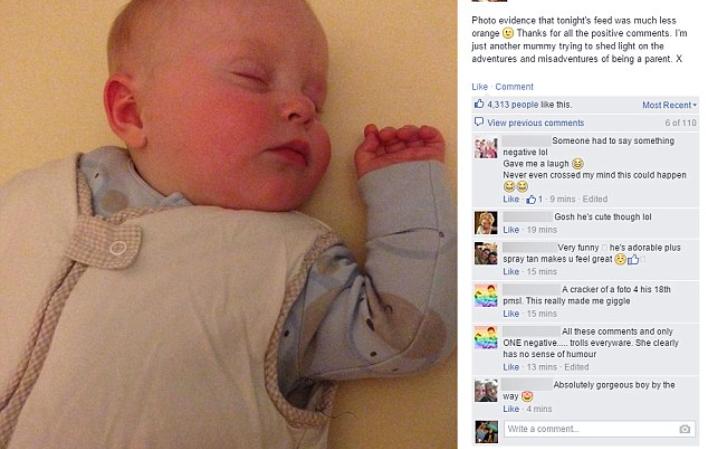 Den brune kulør hun få timer forinden havde fået sprayet på kroppen var nemlig ikke helt tør, og resultatet af dette var, at hendes lille søn pludselig var helt brun i en stor del af ansigtet.