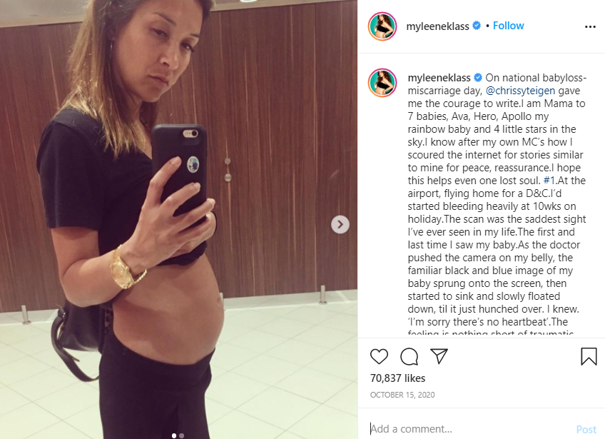 I dag har hun tre børn – Ava, Hero og Apollo. Men på hendes Instgram-profil skrev hun i forbindelse med Pregnancy and Infant Loss Rememberance Day 2020, følgende i et opslag: