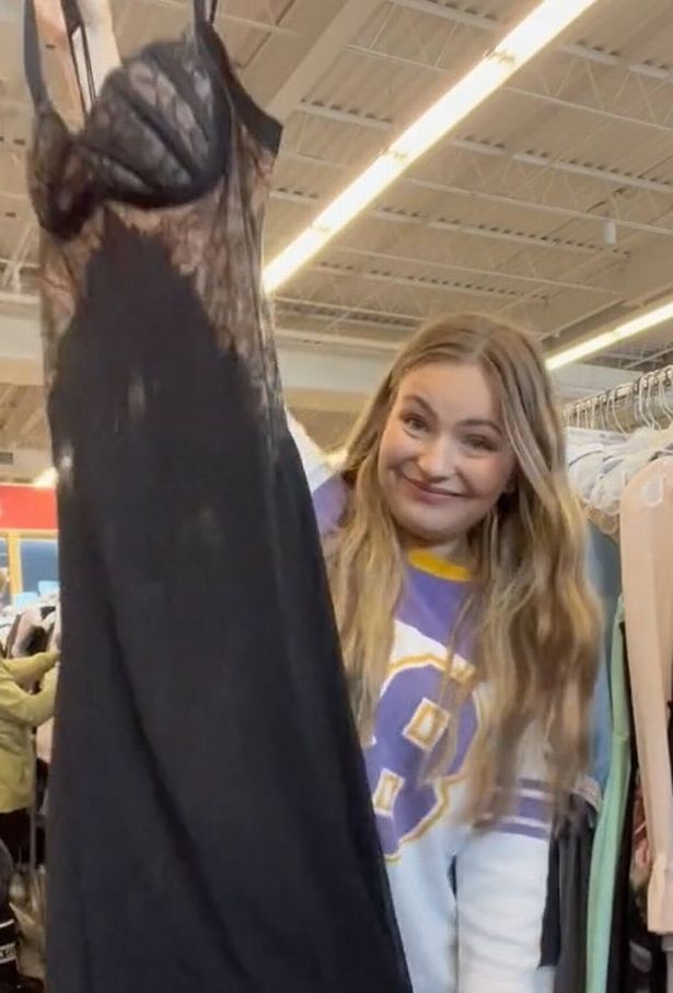 Herefter viser hun en sort og elegant kjole frem, som hun netop har fundet på et stativ i den canadiske genbrugsbutik.